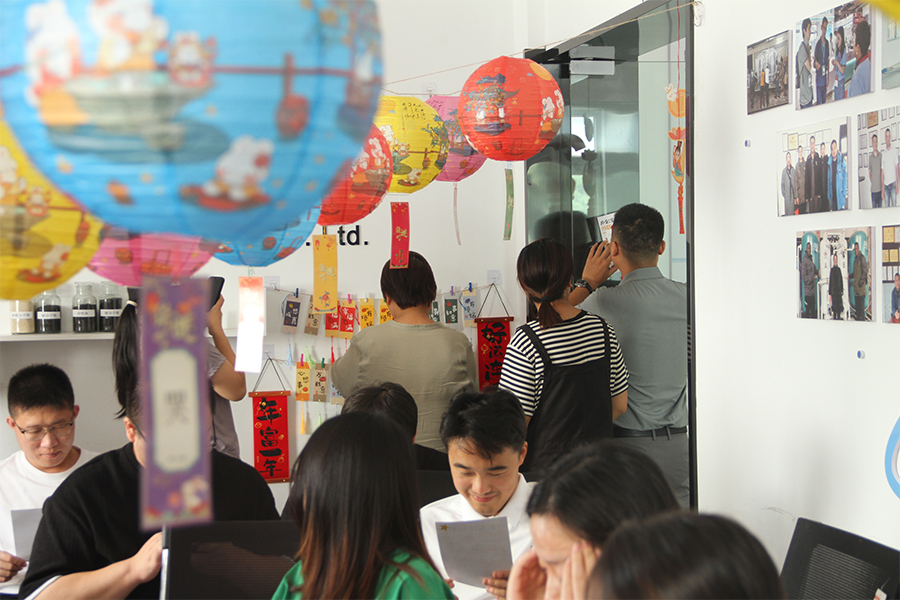 Foram organizadas diversas atividades tradicionais, como resolução de enigmas de lanternas e pintura em leque. O ar encheu-se de risadas durante essas atividades, destacando as diversas capacidades e o ambiente harmonioso dentro da equipe de Jiangsu Luoming.
