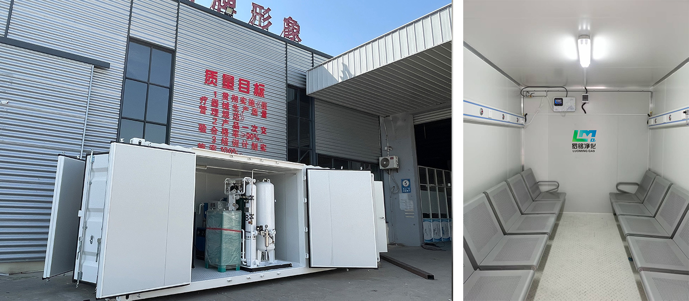 Jiangsu Luoming pode fornecer vários tipos de geradores de oxigênio médico de acordo com a situação real dos clientes: gerador de oxigênio médico tipo contêiner/reboque/caixa, veículo móvel com barra de oxigênio (incluindo área de produção de oxigênio e área de absorção de oxigênio), estação de oxigênio, etc.